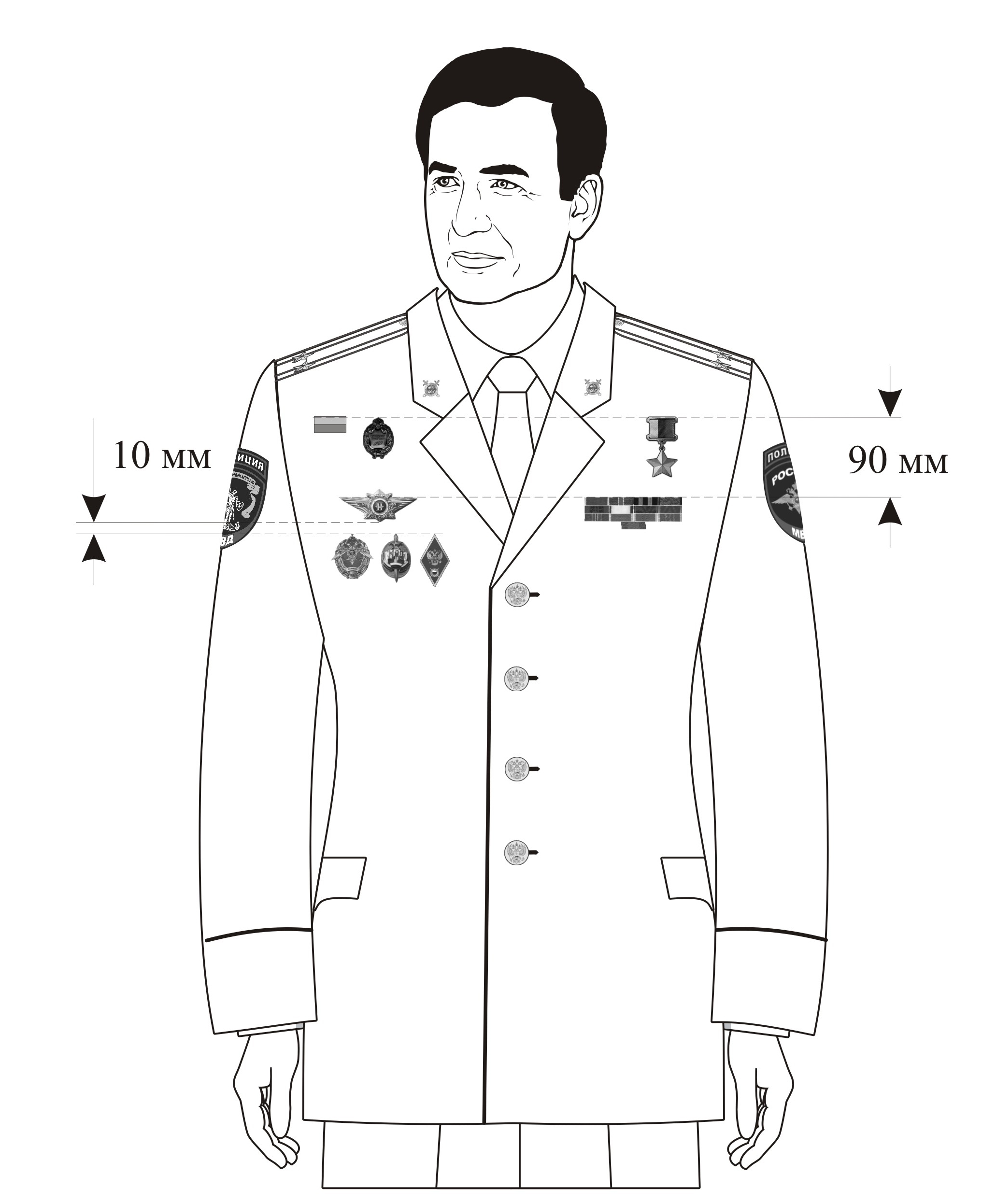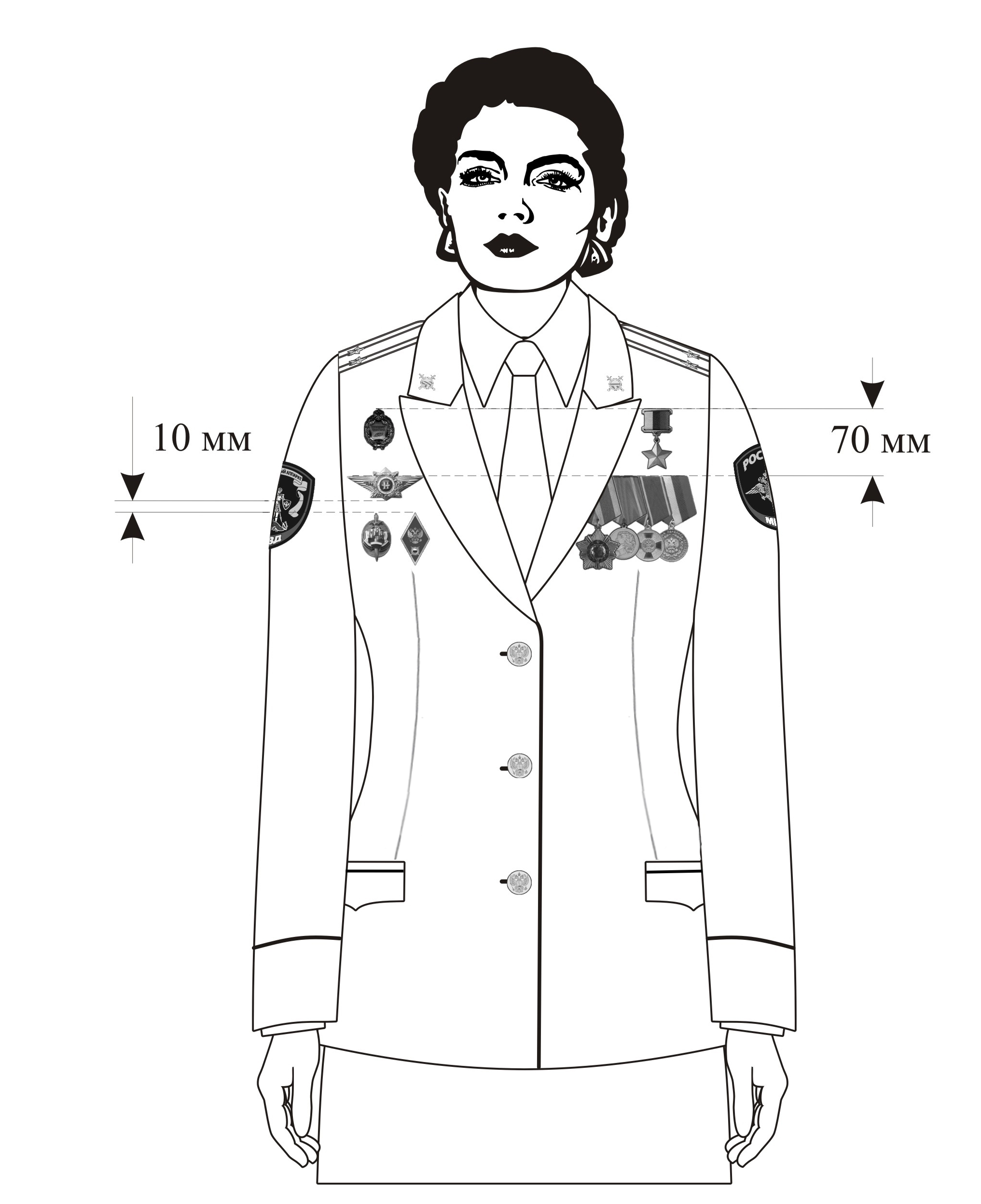 на двубортном кителе, жакетах – так, чтобы верхний край первого ряда планок располагался ниже уровня уступа лацкана на 70 мм;