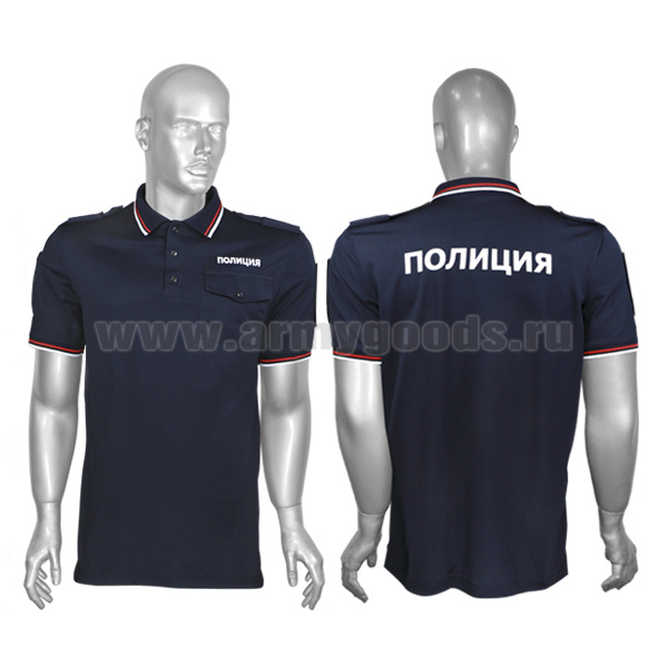 Рубашка поло Полиция (кор рук) с печатью на спине и липучками для шевронов (ПЭ/вискоза, плотность 170 гр/м2) воротник и рукава триколор
