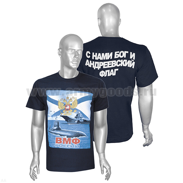 Футболка с рисунком краской ВМФ России, подводная лодка и корабль (на спине надпись) темно-синяя