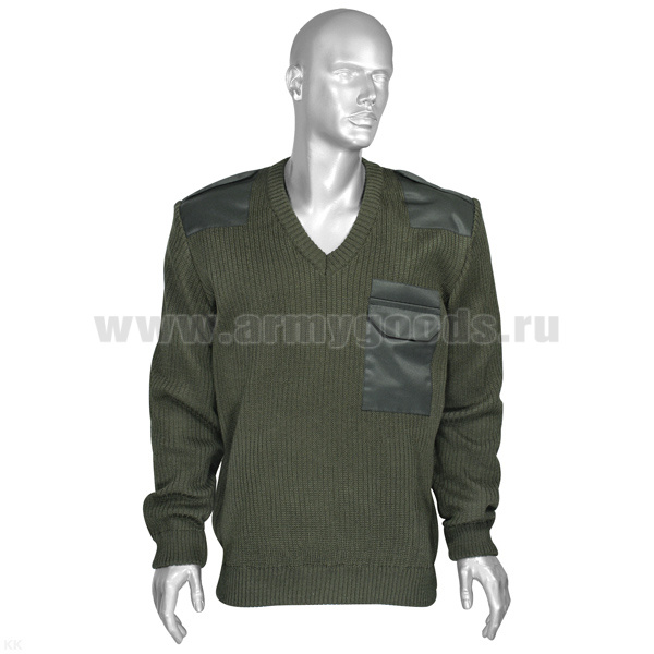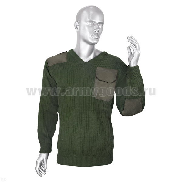 Свитер ПАН 100 % с накладками оливковый (вырез под горло V-образный)
