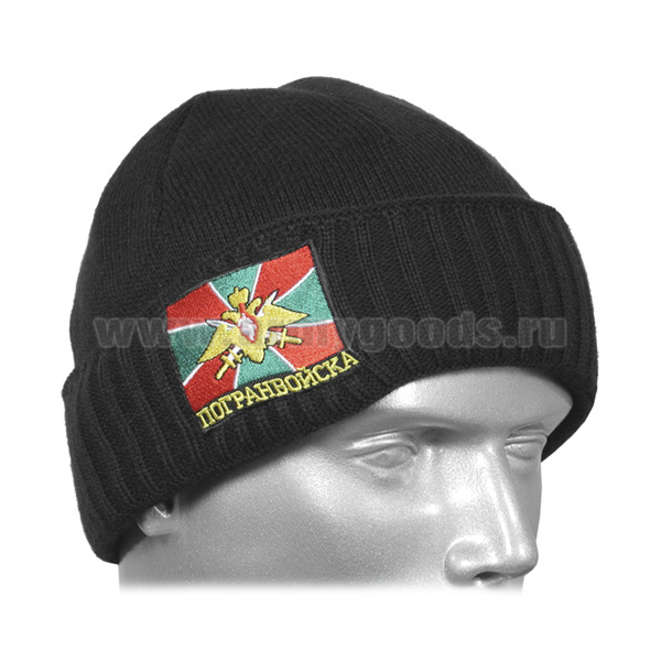 Шапка вязаная двойная п/ш черная с вышивкой ПОГРАНВОЙСКА (флаг ПВ ФПС РФ)