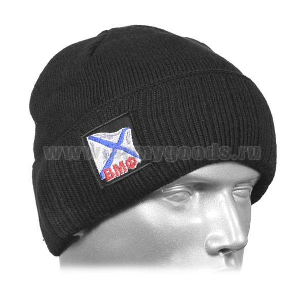Шапка вязаная двойная п/ш черная с вышивкой ВМФ (Андреевский флаг)