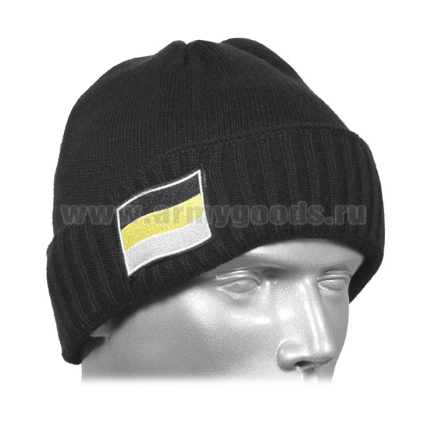 Шапка вязаная двойная п/ш черная с вышивкой Флаг Российской империи