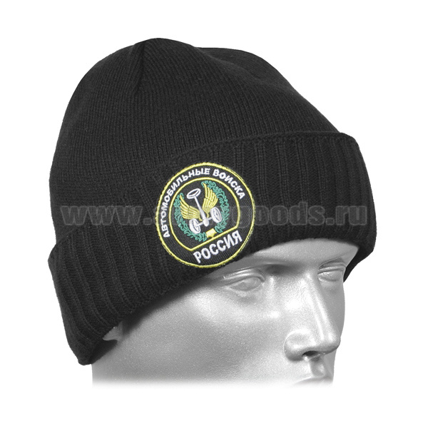 Шапка вязаная двойная п/ш черная с вышивкой Автомобильные войска (эмблема ст/обр)