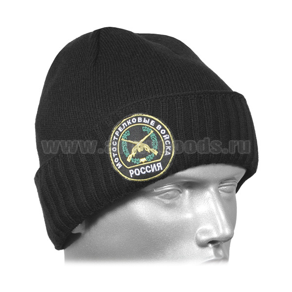 Шапка вязаная двойная п/ш черная с вышивкой Мотострелковые войска (эмблема ст/обр)