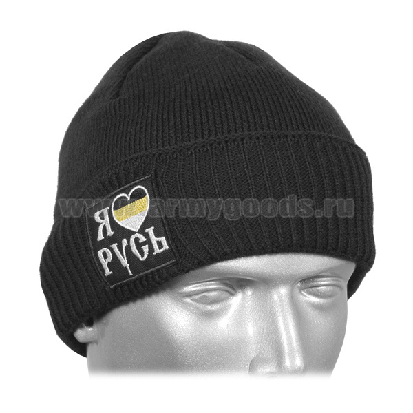 Шапка вязаная двойная п/ш черная с вышивкой Я люблю Русь (флаг Рос.империи)