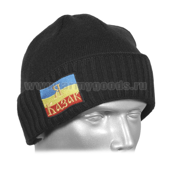 Шапка вязаная двойная п/ш черная с вышивкой Я казак (син. желт. красн.)