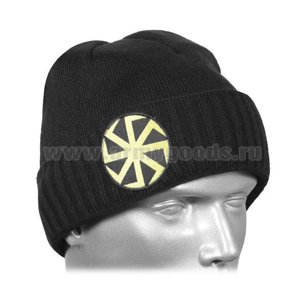 Шапка вязаная двойная п/ш черная с вышивкой Солнцеворот