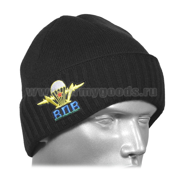 Шапка вязаная двойная п/ш черная с вышивкой эмблема ВДВ
