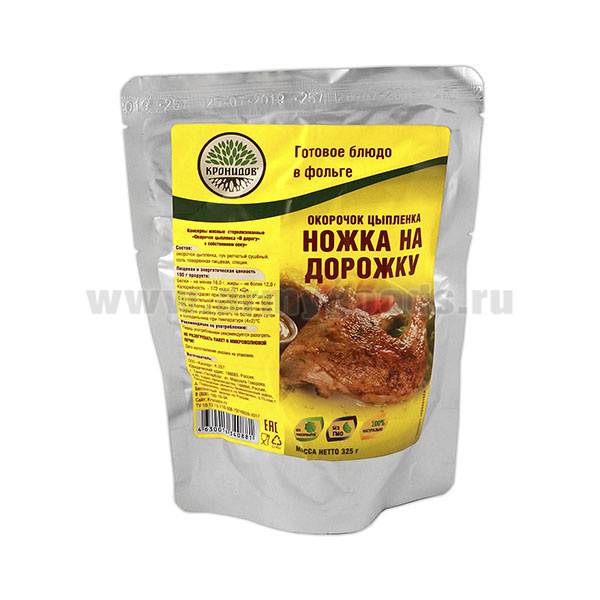 Консервы обеденные Окорочок цыпленка "Ножка на дорожку" в собственном соку (325 г) (готовое блюдо в фольге)