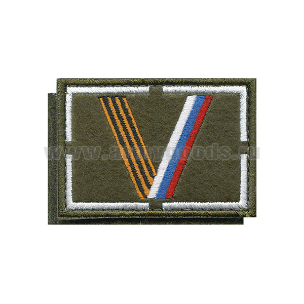 Шеврон вышит. на кепку V (оливк фон, вышивка триколор/гвардейск) 70х50 мм на липучке