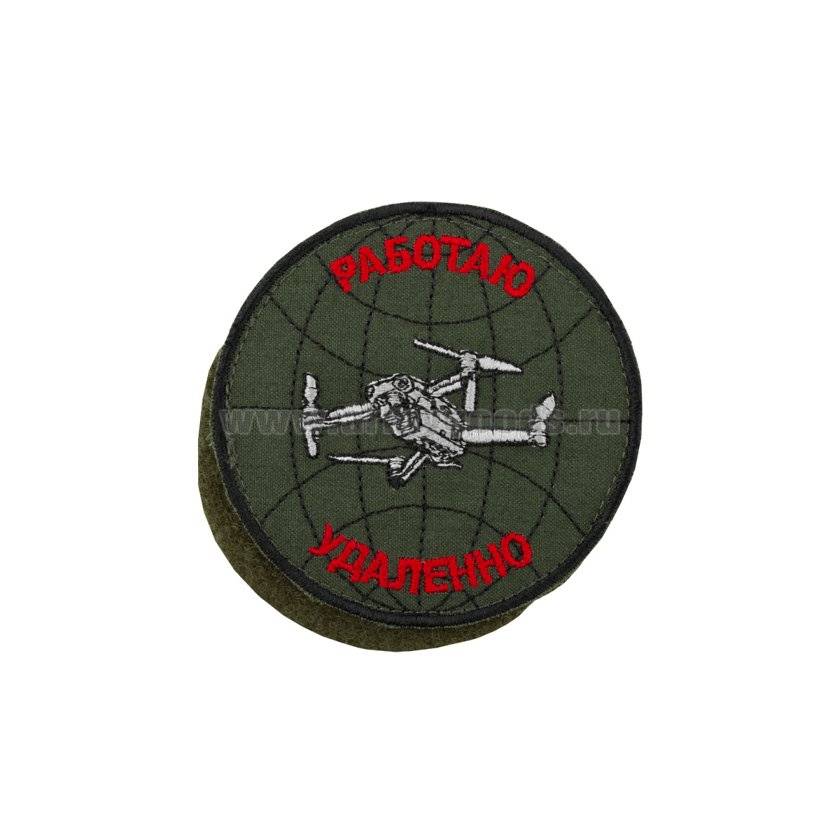 Шеврон вышит. Работаю удаленно (оливковая ткань) (d=8см) на липучке