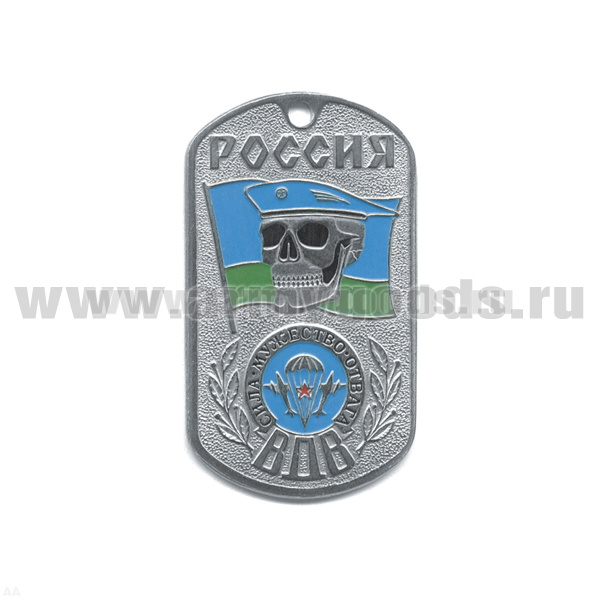 Жетон (нерж. ст., эмал.) Россия ВДВ (череп в голуб. берете на фоне флага ВДВ) Сила Мужество Отвага