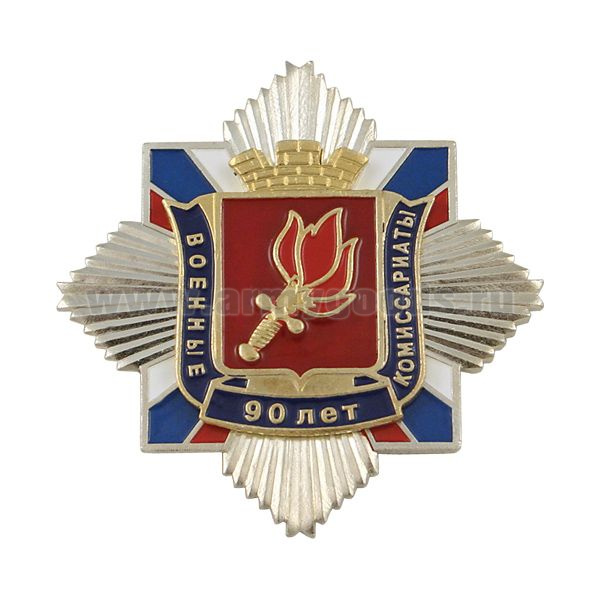 Значок мет. 90 лет военным комиссариатам (серебряные лучи и триколор с накладкой - щит с короной) хол.эм.