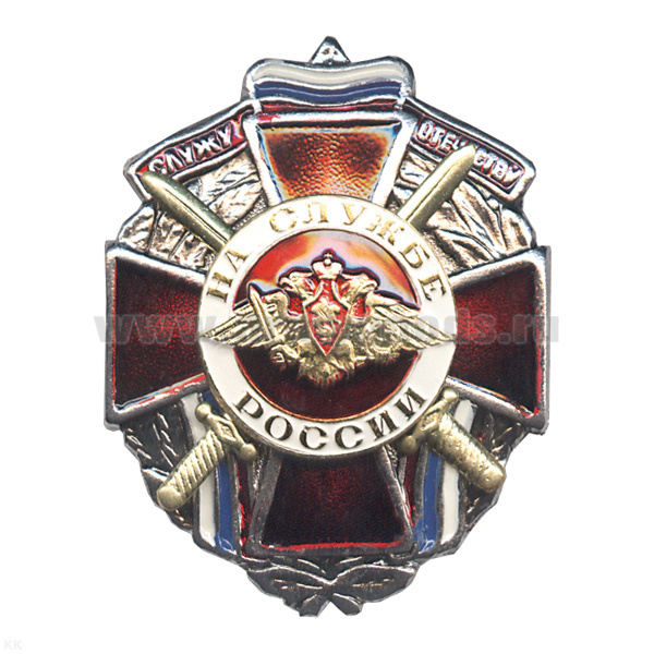 Значок мет. На службе России (служу отечеству) красн. крест с орлом РА и мечами