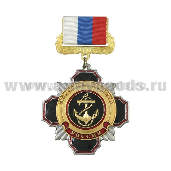 Медаль Стальной черн. крест с красным кантом Морская пехота (на планке - лента РФ)