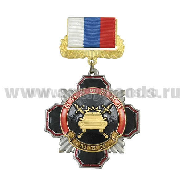 Медаль Стальной черн. крест с красн. кантом Полиция (с эмблемой ГАИ) (на планке - лента РФ)