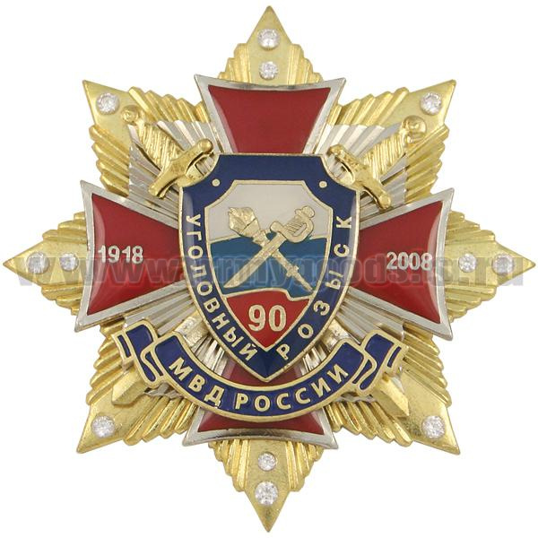 Значок мет. 90 лет Уголовному розыску МВД России 1918-2008 (красн. крест с накл., заливка смолой, на звезде с фианитами)