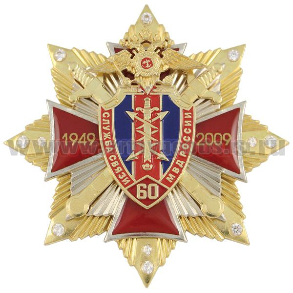 Значок мет. 60 лет службе связи МВД России (красн. крест, смола, на звезде с фианитами)