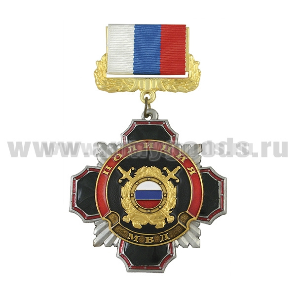 Медаль Стальной черн. крест с красн. кантом Полиция (с эмблемой Охраны общественного порядка) (на планке - лента РФ)