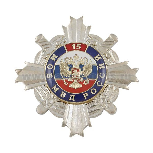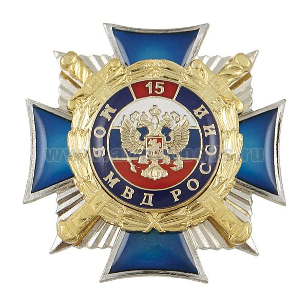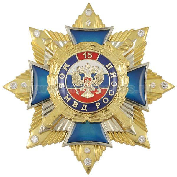 Значок мет. 15 лет МОБ МВД России (син. крест с накл., смола, на звезде с фианитами)