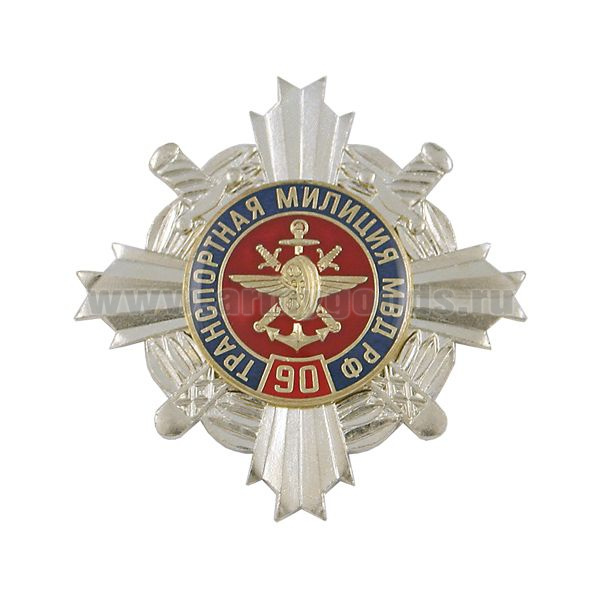 Значок мет. 90 лет Транспортной милиции МВД РФ (серебр. крест с эмбл. ВОСО, смола)