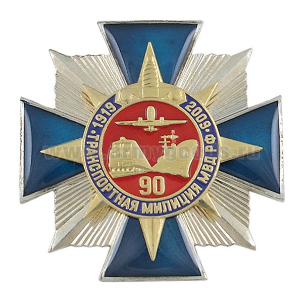 Значок мет. 90 лет Транспортной милиции МВД РФ 1919-2009 (синий крест, с накл., смола)