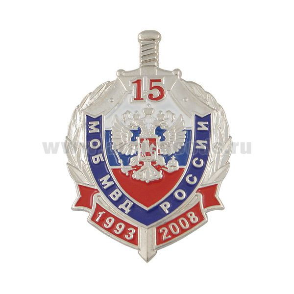Значок мет. 15 лет МОБ МВД России 1993-2008 (серебр. щит и меч)