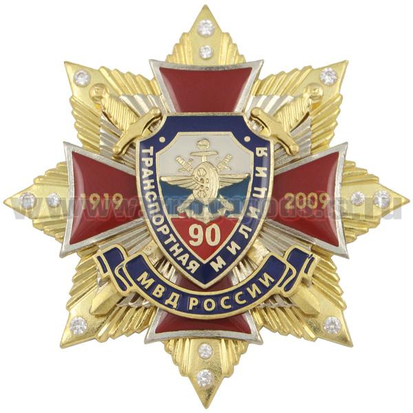 Значок мет. 90 лет Транспортной милиции МВД России 1919-2009 (красн. крест с накл., заливка смолой, на звезде с фианитами) с эмбл. ВОСО