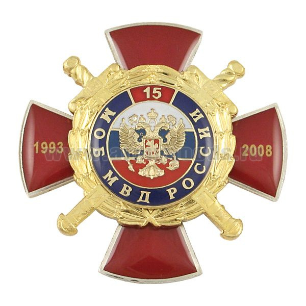 Значок мет. 15 лет МОБ МВД России 1993-2008 (красн. крест с накл., смола)