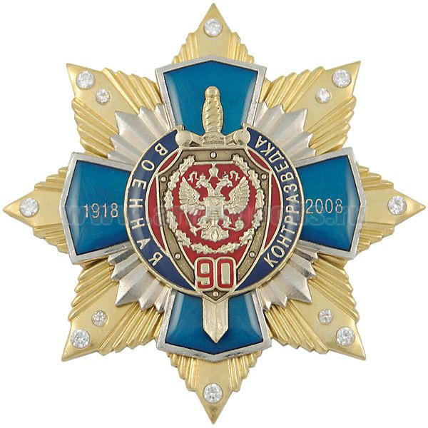 Значок мет. 90 лет военной контрразведке 1918-2008 (синий крест с накл., смола, на звезде с фианитами)