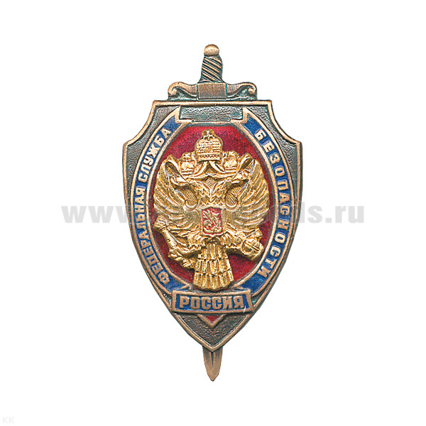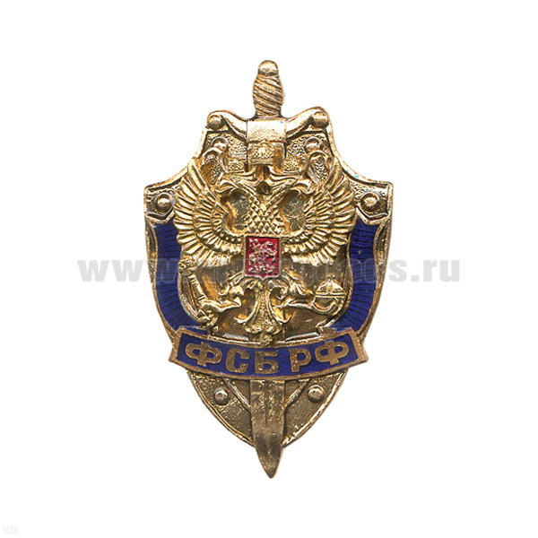 Значок мет. ФСБ с накл. орлом (мал.) на пимсе (аббревиатура на синей ленте)