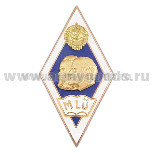 Значок мет. Университет марксизма-ленинизма (ромбик с надписью MLU на открытой книге, гербом СССР и профилями Ленина и Маркса на синем фоне)
