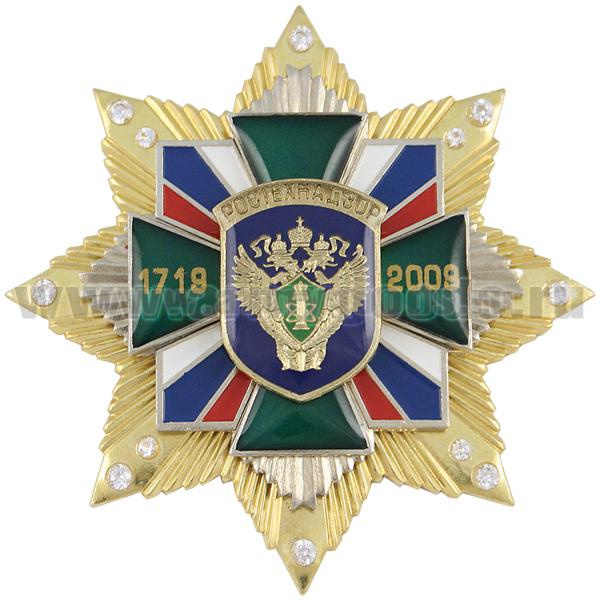Значок мет. Ростехнадзор 1719-2009 (зел. крест с накл., заливка смолой, на звезде с фианитами)