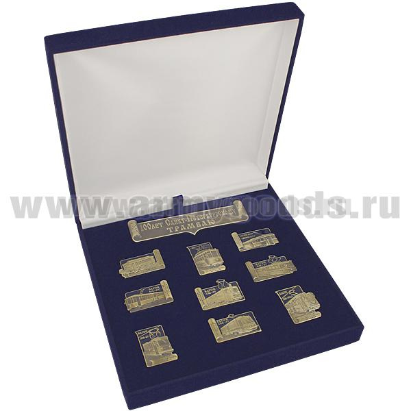 Набор значков коллекционный 100 лет петербургскому трамваю 1907-2007 (9 значков в бархатной коробочке)