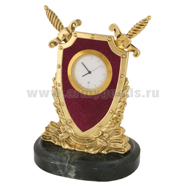 Часы сувенирные настольные (литье бронза, камень змеевик зеленый) Щит и два меча
