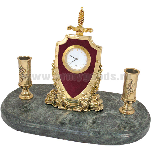 Часы сувенирные настольные с письменным прибором (литье бронза, камень змеевик зеленый) Щит и меч