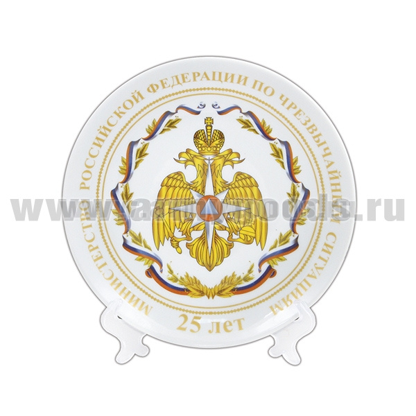 Тарелка сувенирная 25 лет МЧС России (орел МЧС) (в компл. с настольной подставкой) d=10 см