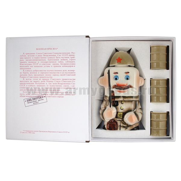 Фляга фарф. (0,25 л) + 3 рюмки в книжке-обманке Солдат с винтовкой