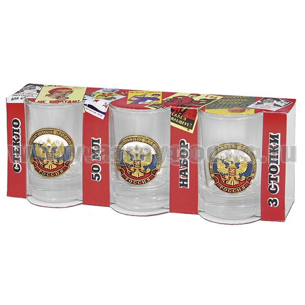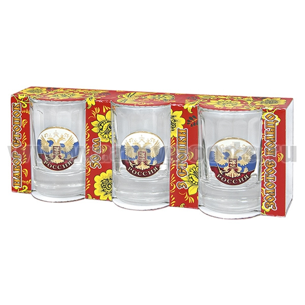 Стопки стеклянные (3x50 мл) с накладками Россия (орел РФ на триколоре)