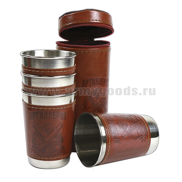 Стопки мет. (4х125 мл) с тиснением на коже Артиллерия Бог войны (в чехле)