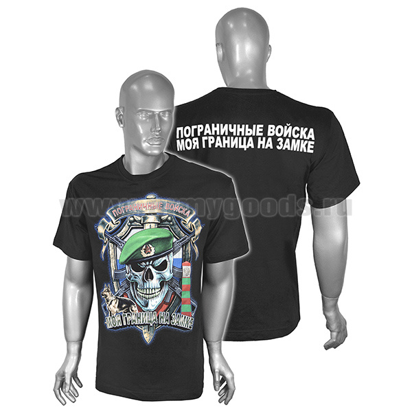 Главная-01 ОДЕЖДА-0140 ФУТБОЛКИ С ПОЛНОЦВЕТНЫМ ИЗОБРАЖЕНИЕМ, НАНЕСЕННЫМ КРАСКОЙ-Футболка с рис краской Пограничные войска Моя граница на замке (череп в зеленом берете) черная