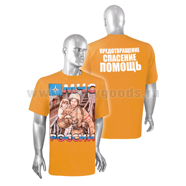 Главная-01 ОДЕЖДА-0140 ФУТБОЛКИ С ПОЛНОЦВЕТНЫМ ИЗОБРАЖЕНИЕМ, НАНЕСЕННЫМ КРАСКОЙ-Футболка с рисунком краской МЧС России (пожарный с девочкой) оранжевая