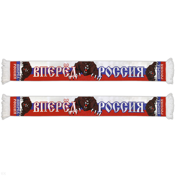 Шарф сувенирный (шелк полиэфирный) Вперед Россия (цвета РФ, медведь)