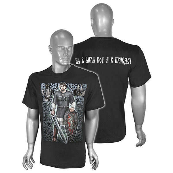 Главная-01 ОДЕЖДА-Футболка с рис краской Не в силе Бог, а в правде (воин с мечом) черная (может отсутствовать надпись на спине)