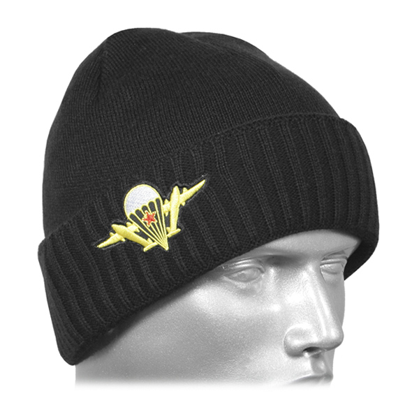 Шапка вязаная двойная п/ш черная с вышивкой эмблема ВДВ