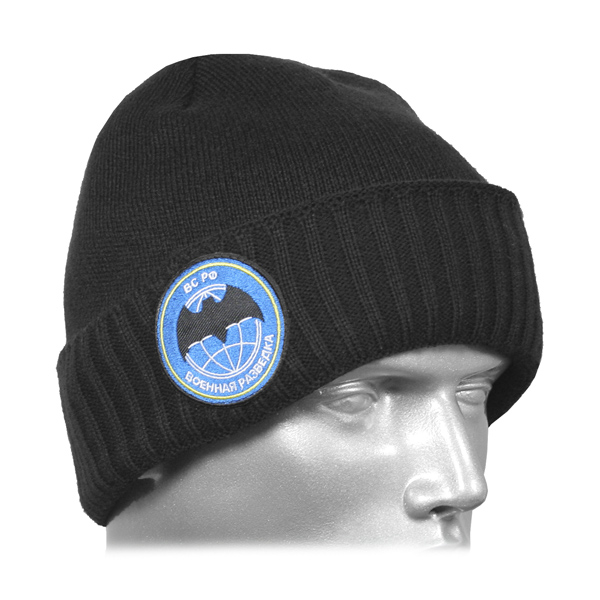 Шапка вязаная двойная п/ш черная с вышивкой Военная разведка ВС РФ