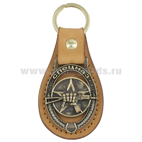 Брелок мет. (литье) на подкладке из нат. кожи Спецназ (кулак с автоматом на звезде)