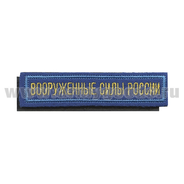 Главная-16 ВЫШИВКА (шевроны, нашивки, вымпелы)-Нашивка на грудь вышит. Вооруженные силы России (125x25 мм) васильковый фон, голубой кант ЛИПУЧКА