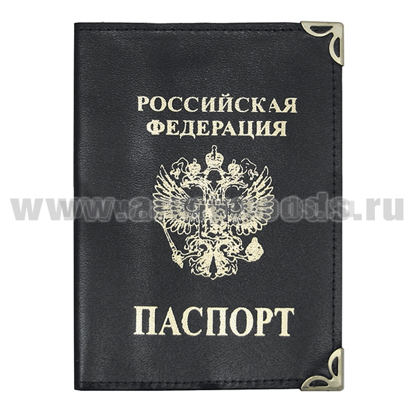 Обложка кожа Паспорт РФ (черная вертикальная) с мет. уголками и прорезями для кредитных карт